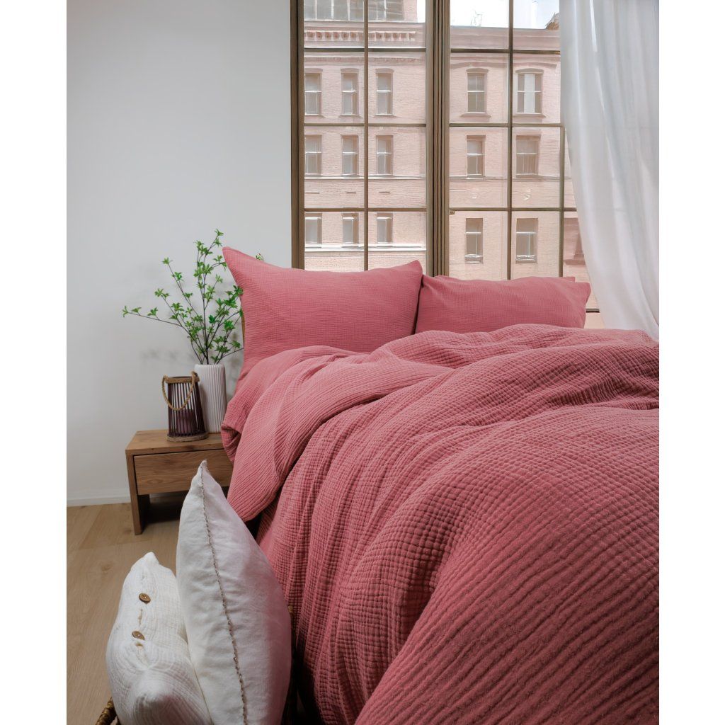 Charakteristické jemné záhyby mušelínu po praní jsou záměrné — jsou součástí estetiky, nikoliv chybou. CAPRI po vyprání stačí pověsit, nechat uschnout a přímo povléknout na postel. Žádná žehlička, žádná námaha. Maximální pohodlí při péči o domácnost.