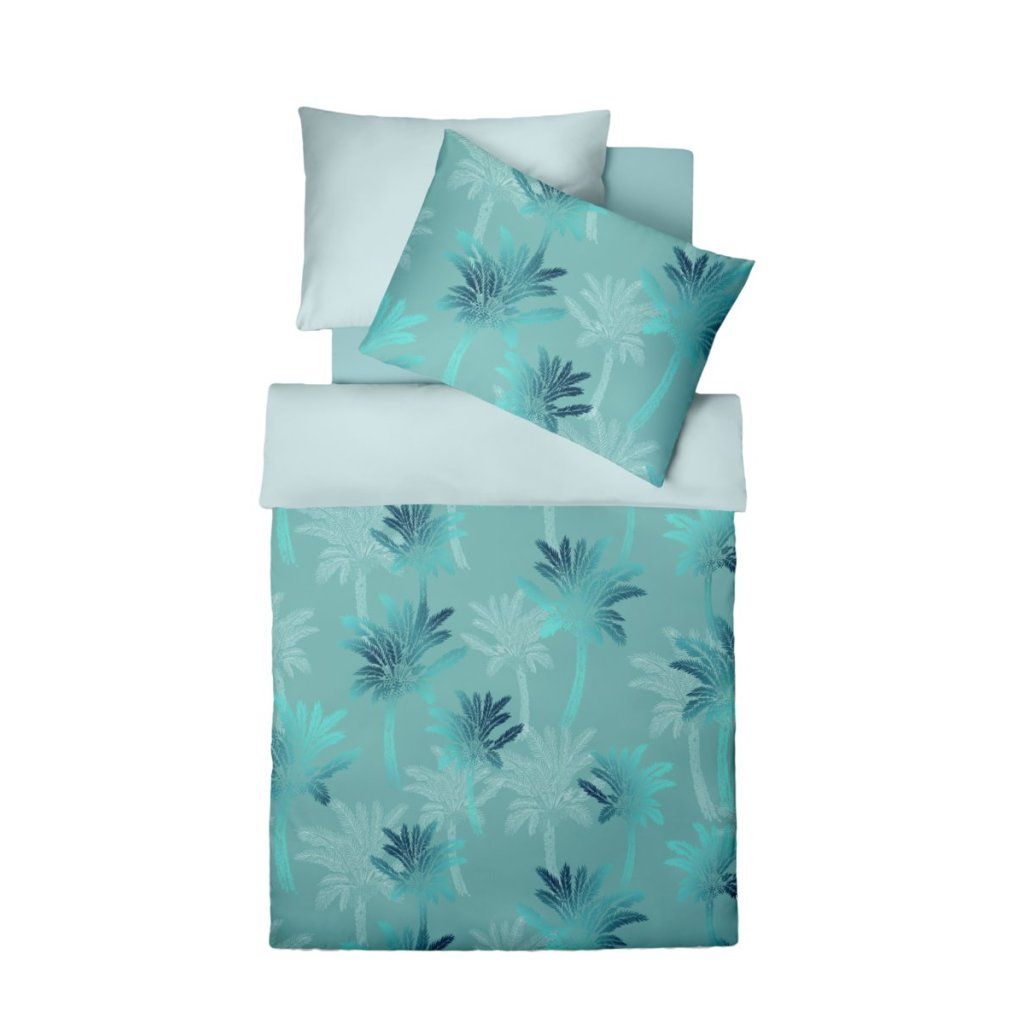 Přední strana: palmový vzor v tyrkysové a tmavě modré. Zadní strana: jednobarevná mintová Mako-Satin. Tropická atmosféra nebo čistý klidný mint — obojí v jednom povlečení.